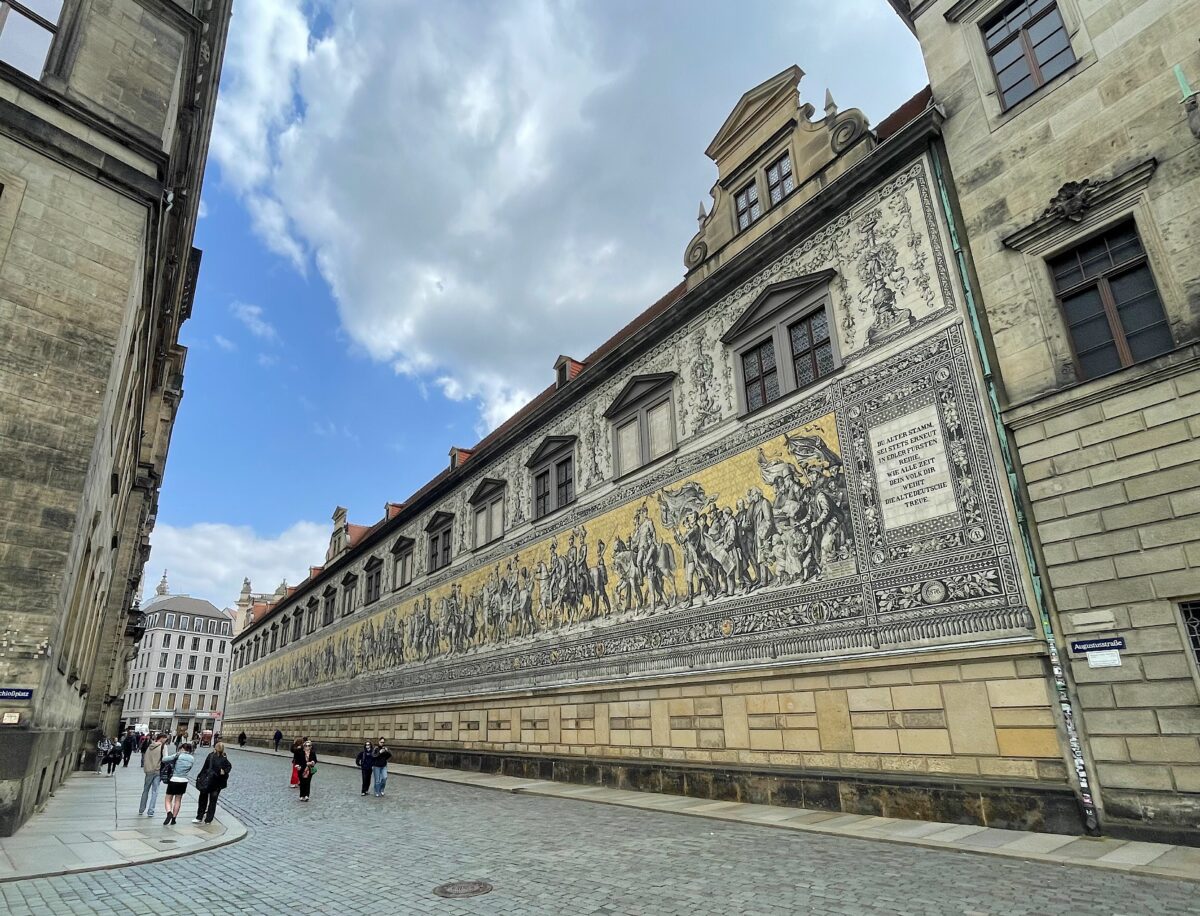 レジデンツ宮殿の北東側に位置し、ヨーロッパ最古の武芸競技場であった「Stallhof シュタルホフ」の外壁には、マイセン磁器製の約20センチ四方のタイル25,000枚、全長101メートルにも及ぶ巨大な壁画があります。1123年から1904年までのザクセン君主の騎馬像や、時代を彩った芸術家たちが描かれています。