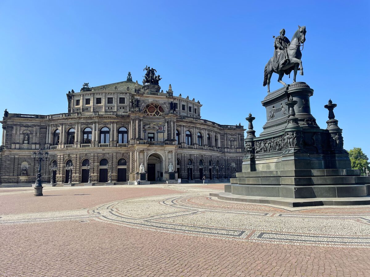 1838年から1841年にかけて建てられたザクセン州立歌劇場は、戦後40年かけて1985年に再建されました。劇場前の広場には、この劇場を発注したザクセン王ヨハンの騎馬像が聳えています。