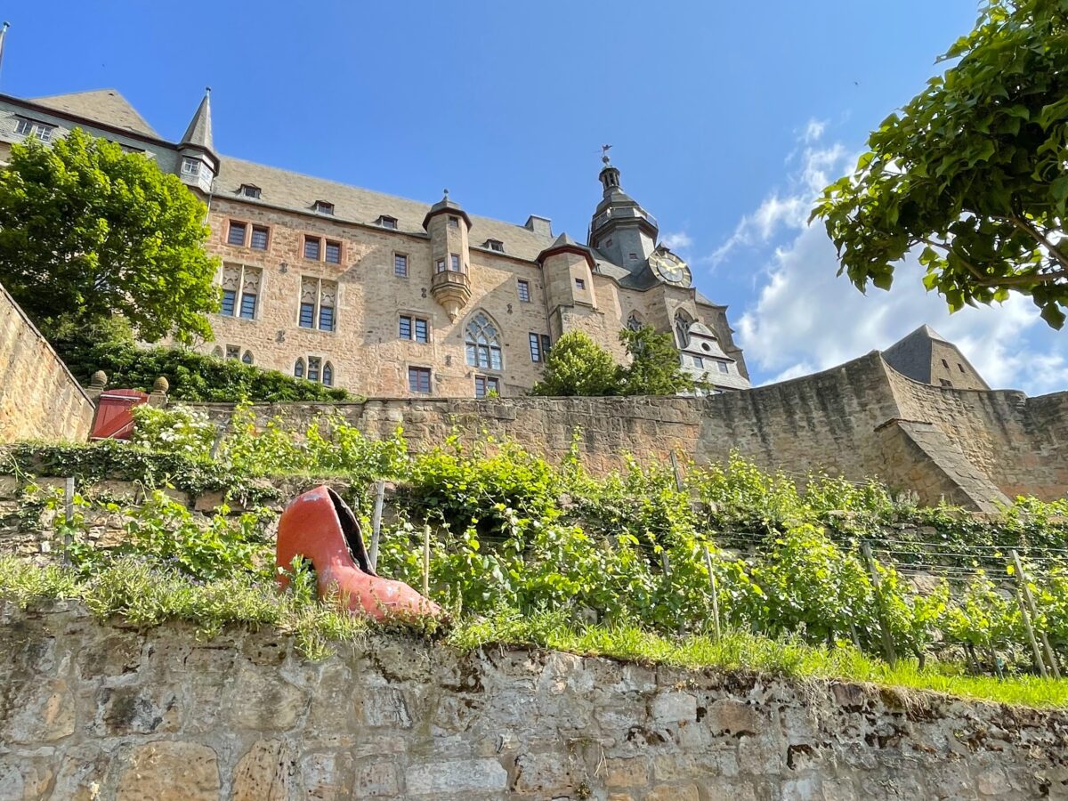 ルーテル教会からマールブルク城へ向か石段への入り口お城の12時の鐘の音とともに、階段を駆け降りたときに脱げてしまったシンデレラの靴。オブジェはガラスではなく赤いハイヒール靴ですが、とても存在感があり目立ちます。