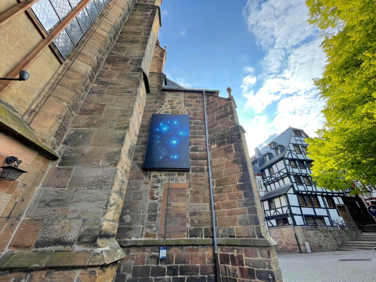 Wettergasse ヴェターガッセをさらに進みますと、通りの名前が Reitgasse ライトガッセに変わりますが、突き当たりの旧大学に併設されている福音教会の壁に「星の銀貨」のオブジェを見つけることができます。