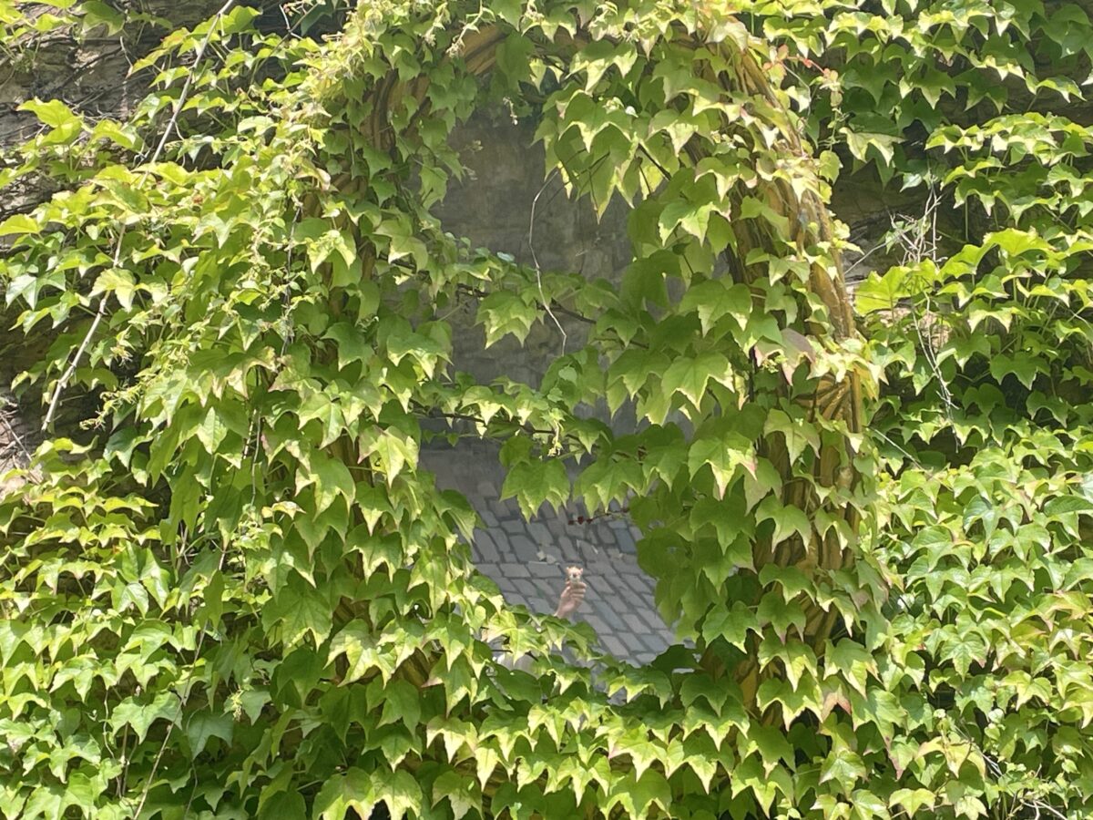 ▼ 写真ですと蔦の葉で見えにくいですが、やや下向きに楕円形の鏡が設置されています。秋から春にかけての期間は、葉が落ちて見つけやすいと思います。