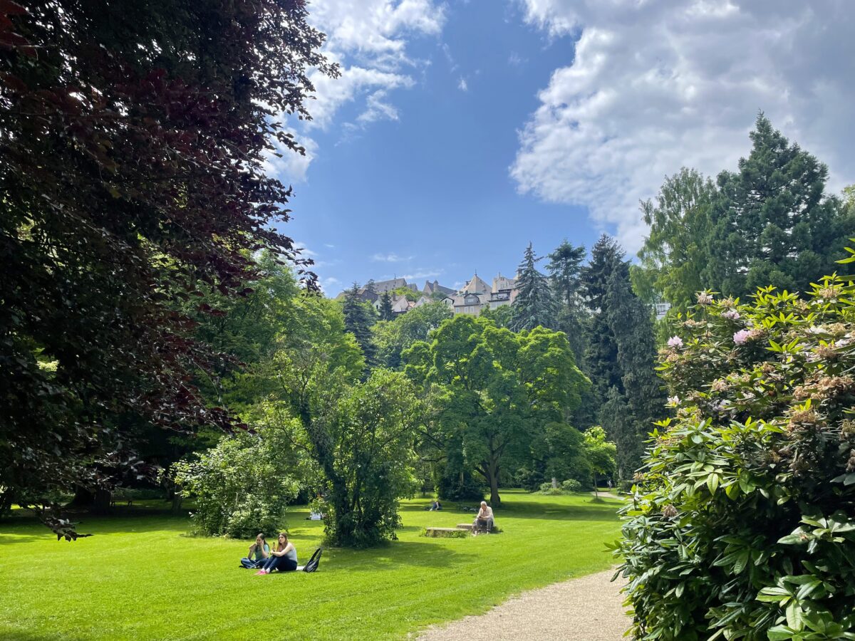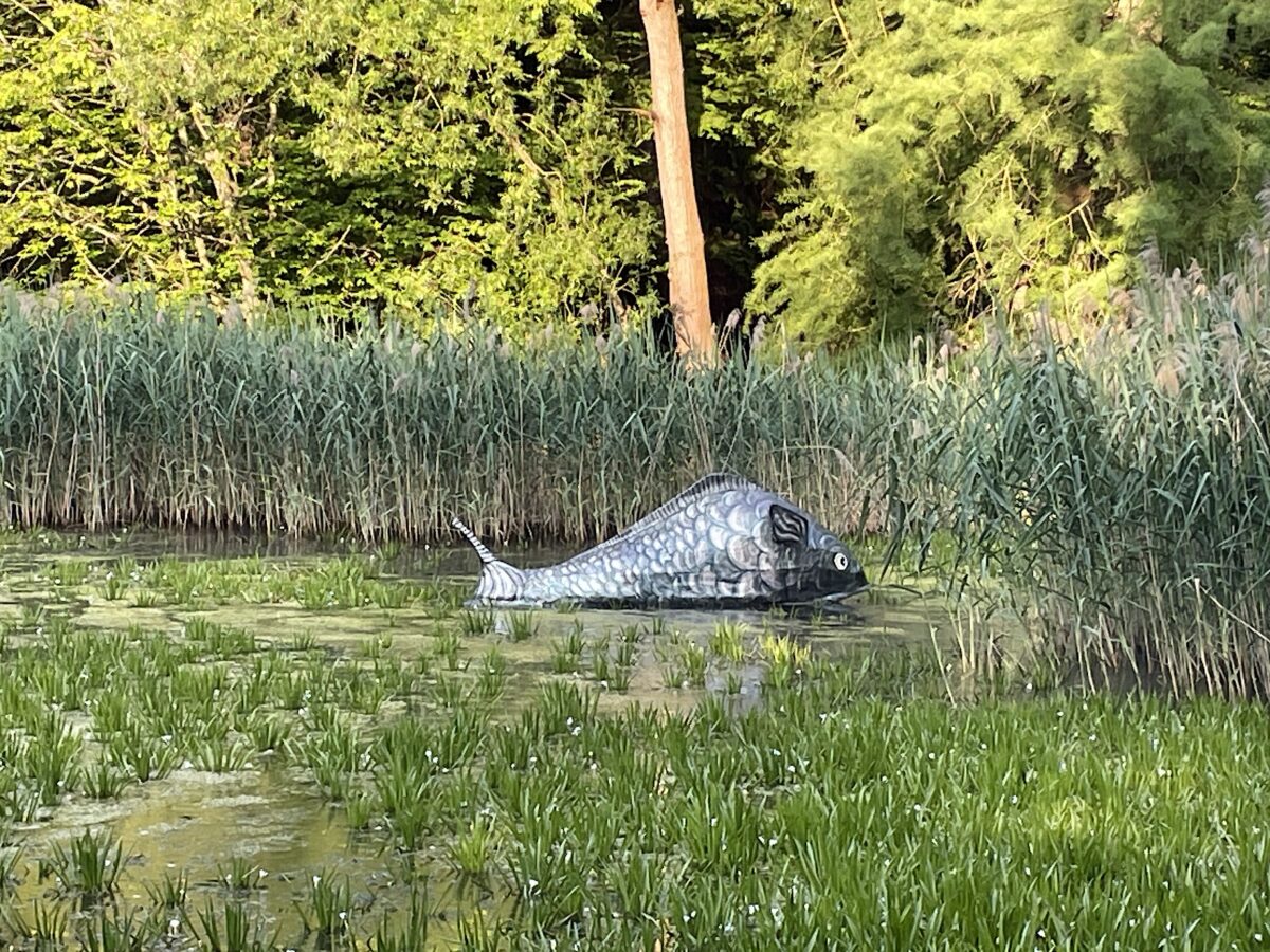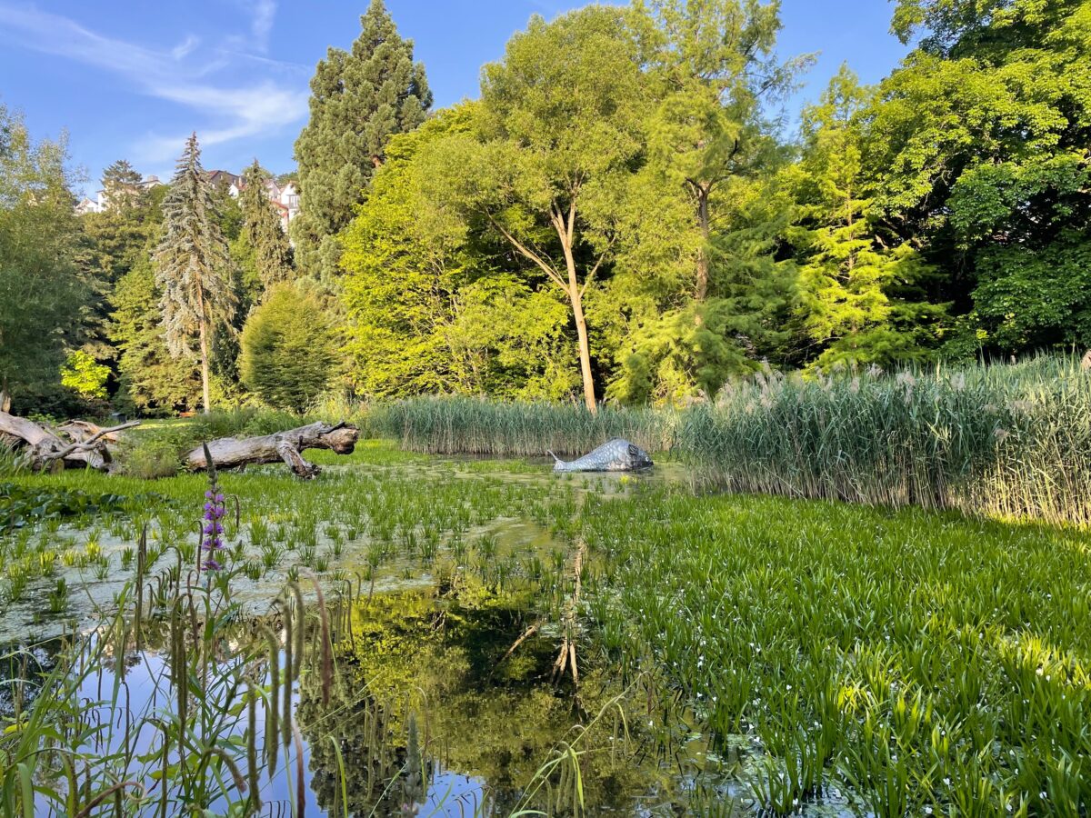 ▼ 旧市街から Pilgrimstein 通りを挟んで東側に広がる Alter Botanischer Garten 庭園の中央にある池に、お魚のオブジェが浮かんでいます。