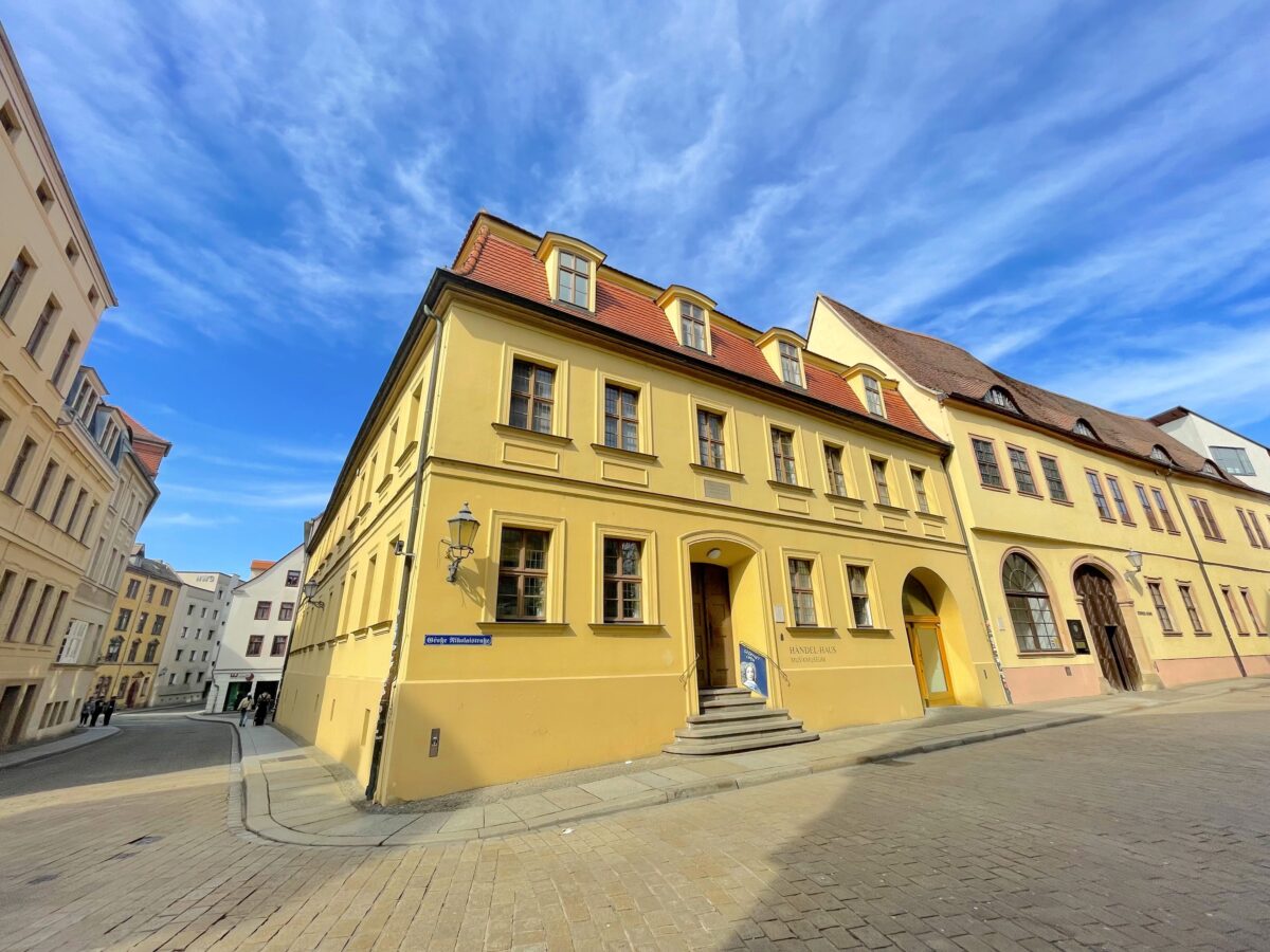 ハレ(ザーレ) のマルクト広場から北へ延びる Kleinschmieden クラインシュミーデン通りを歩き、Große Nikolaistraße グローセ・ニコライ通りを西へ進んでいきますと、落ち着いた黄色の建物が、Georg Friedrich Händel ゲオルク・フリードリヒ・ヘンデルの生家です。