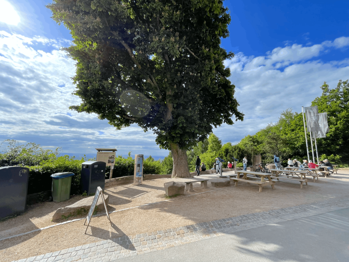 ハイデルベルク城 へ行くケーブルカーを終点まで乗って行き、そこからさらに別のケーブルカーに乗り換えますと到着するのが、標高 567.8メートルの山の頂上 Königstuhl ケーニヒシュトゥール(直訳:王の椅子)駅です。