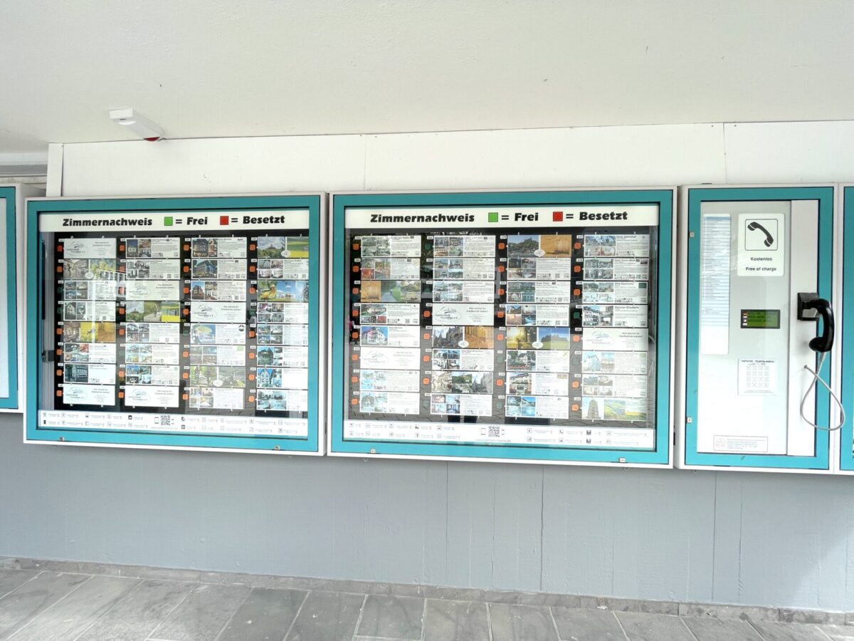 ▼ 観光案内所では、コッヘムのホテルやゲストハウスなどを予約できる無料の電話が設置されています。ドイツ語の Frei は「空室あり」、Besetzt は「満室」を意味します。