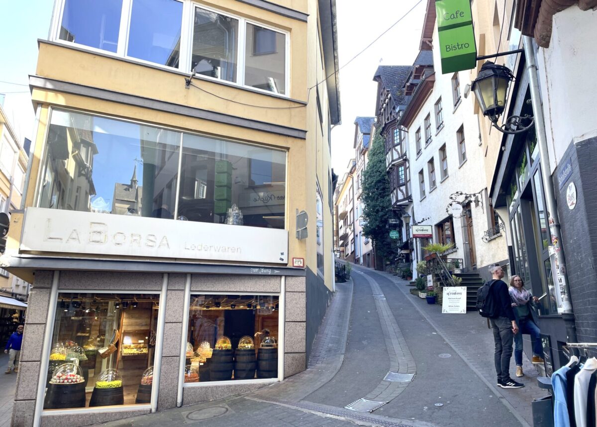 ▼ Herrenstraße ヘルン通りの道が2つに分かれたところを右へ進むと、急勾配の Schlossstraße シュロス通りになります。ここをのぼっていくと、コッヘムのシンボル、Reichsburg Cochem ライヒスブルク城があります。