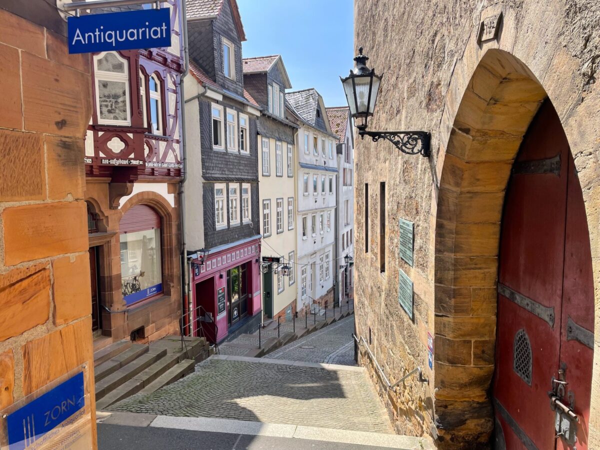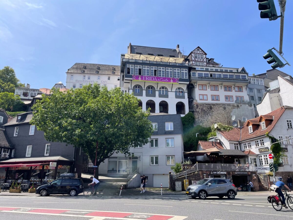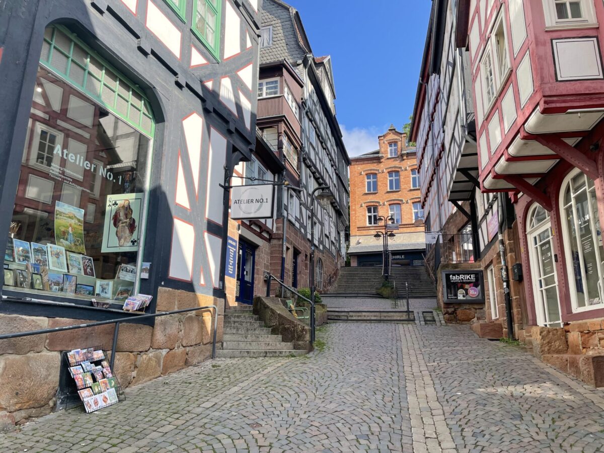 旧市街は、Lahntal ラーン渓谷の西岸からマールブルク城(方伯城)へ向かって斜面に広がっているため、Oberstadt(オーバーシュタット)と呼ばれており、坂道や階段がとても多いので、散策しているだけでもちょっとした運動になります。