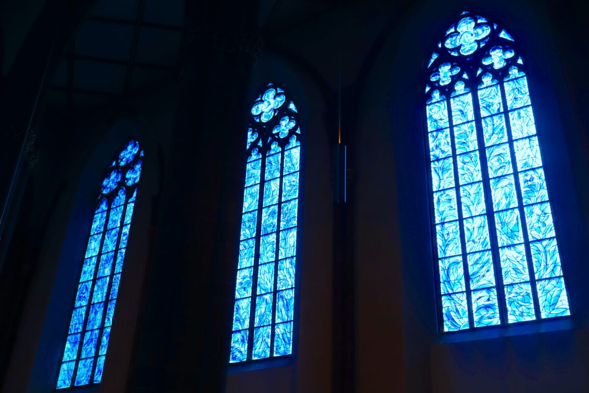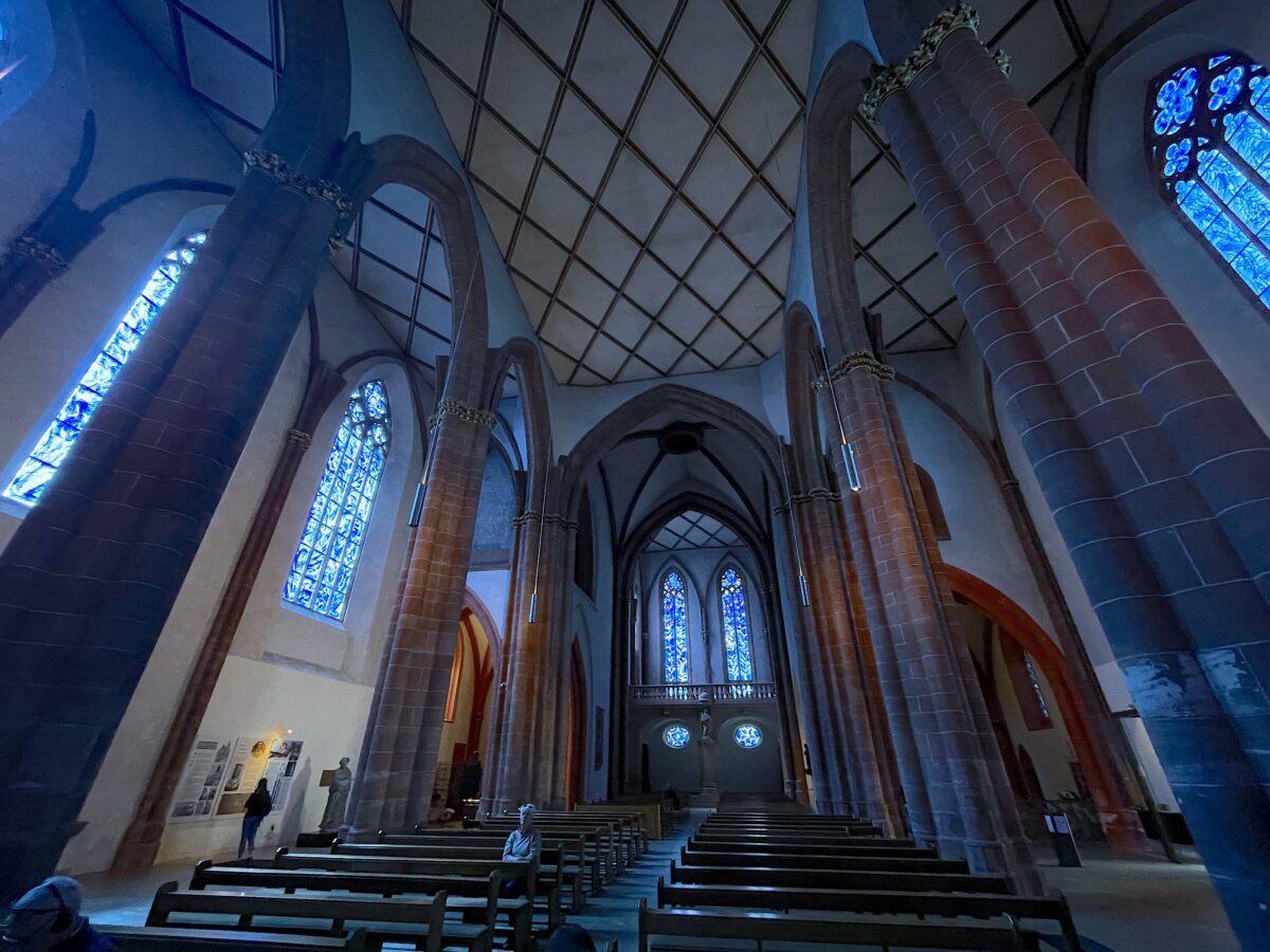 入った途端、「わぁ。。。」と思わず声が出てしまうほど、シャガール様の手がけたステンドグラスを通って差し込む、青く澄んだ光が教会内部を優しく照らしていました。
